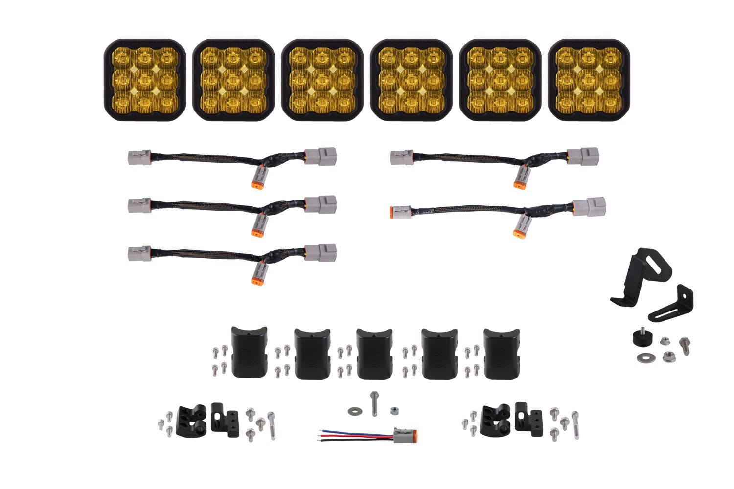 Included in the box: Six (6) Stage Series 5in LED Pods. Five (5) CrossLinks with hardware. One (1) CrossLink support with hardware. One (1) CrossLink endmount kit. Four (4) Ultra Heavy-Duty CrossLink splitters. One (1) Ultra Heavy-Duty Terminating splitter. One (1) Deutsch-style wire pigtail.