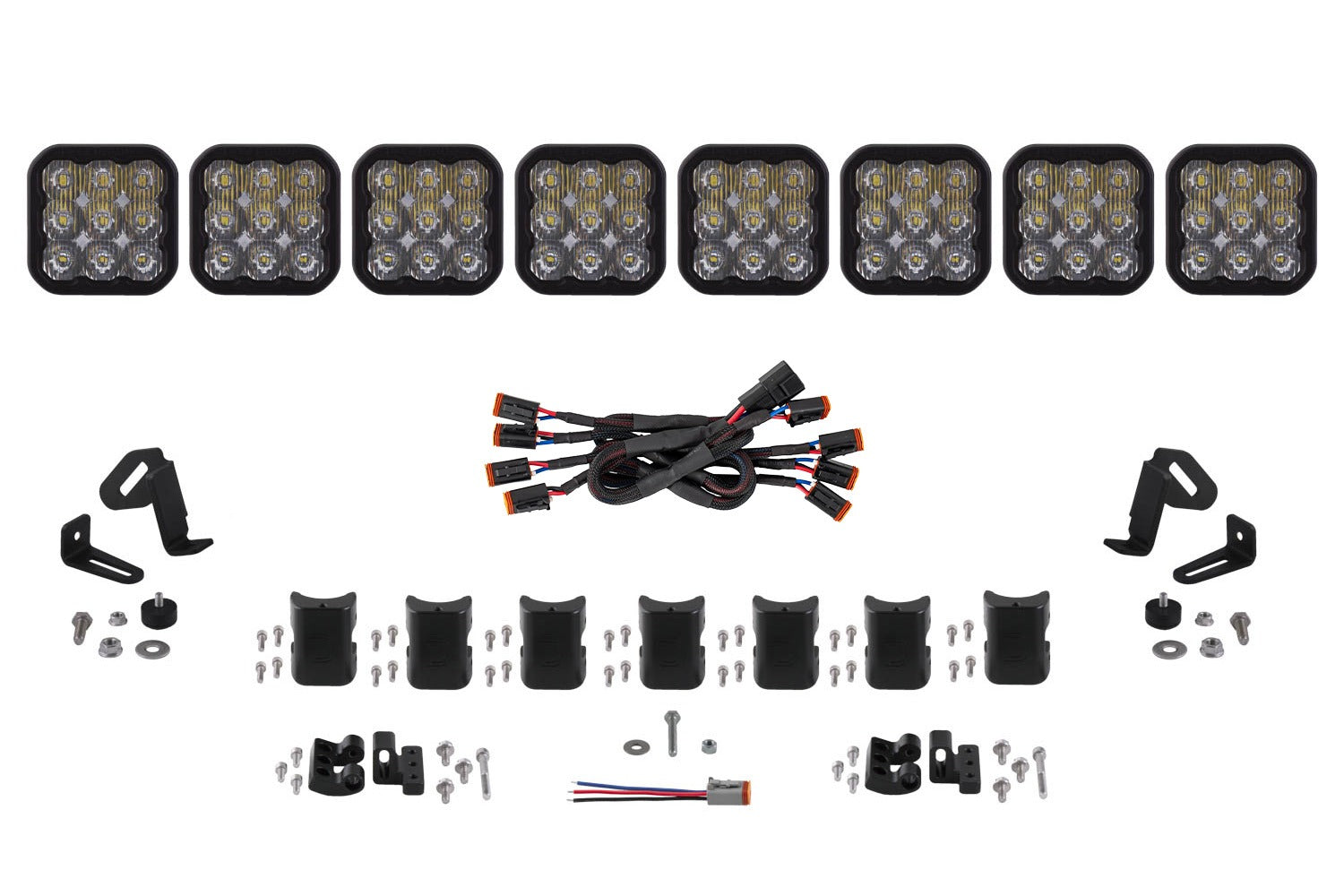 Included in the box: Eight (8) Stage Series 5inch LED Pods. Seven (7) CrossLinks with hardware. Two (2) CrossLink supports. One (1) CrossLink endmount kit. Six (6) Ultra Heavy-Duty CrossLink splitters. One (1) Ultra Heavy-Duty Terminating splitter. One (1) Deutsch-style wire pigtail.