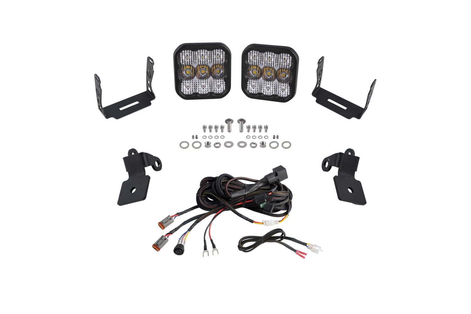 Included in the box: Two (2) SS5 Standard LED Pods. Two (2) A-Pillar LED Pod Brackets for 2020+ Polaris RZR. One (1) Heavy Duty Dual Output 4-pin Wiring Harness. Mounting hardware. Mounting guide.
