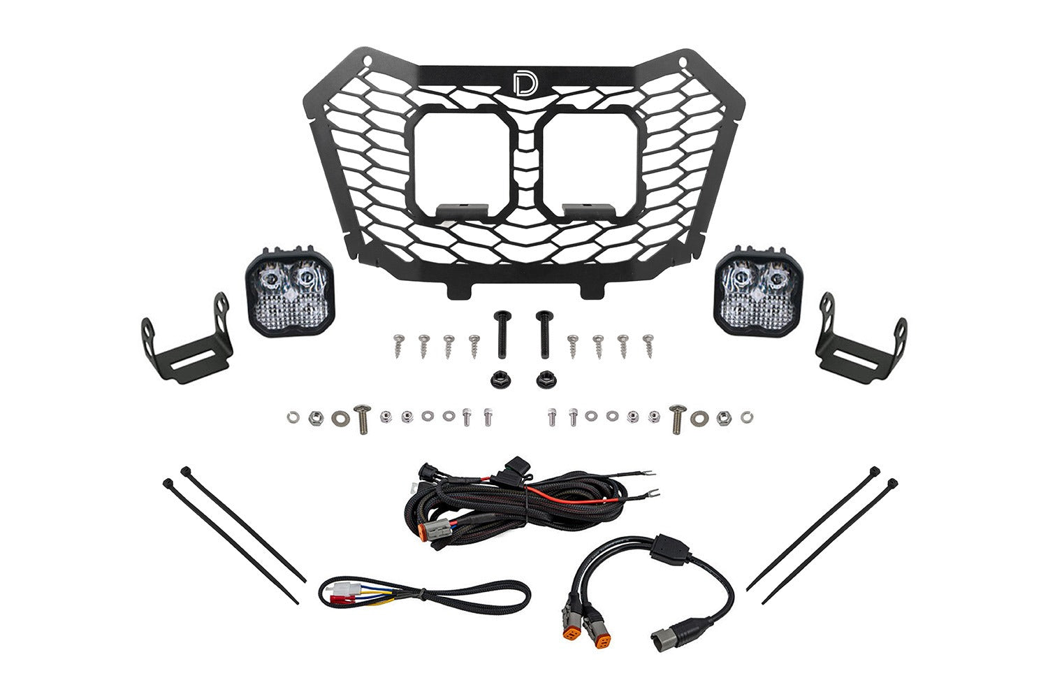 Designed for Performance. The Stage Series LED Grille Kit compatible with the Honda Talon 2022-2024 allows you to replace the factory plastic grille with a durable stainless steel grille using factory mounting points. No cutting or drilling required! This stainless steel grille from Diode Dynamics was specifically designed for the Talon with a honeycomb pattern to match the lower grille and two openings that allow you to mount two SS3 LED pods with a stealth OEM-like appearance. If you ride in dusty conditions this is the perfect kit for you. The included SS3 LED pods will cut through dust and fog with ease giving you more visibility in undesirable conditions.