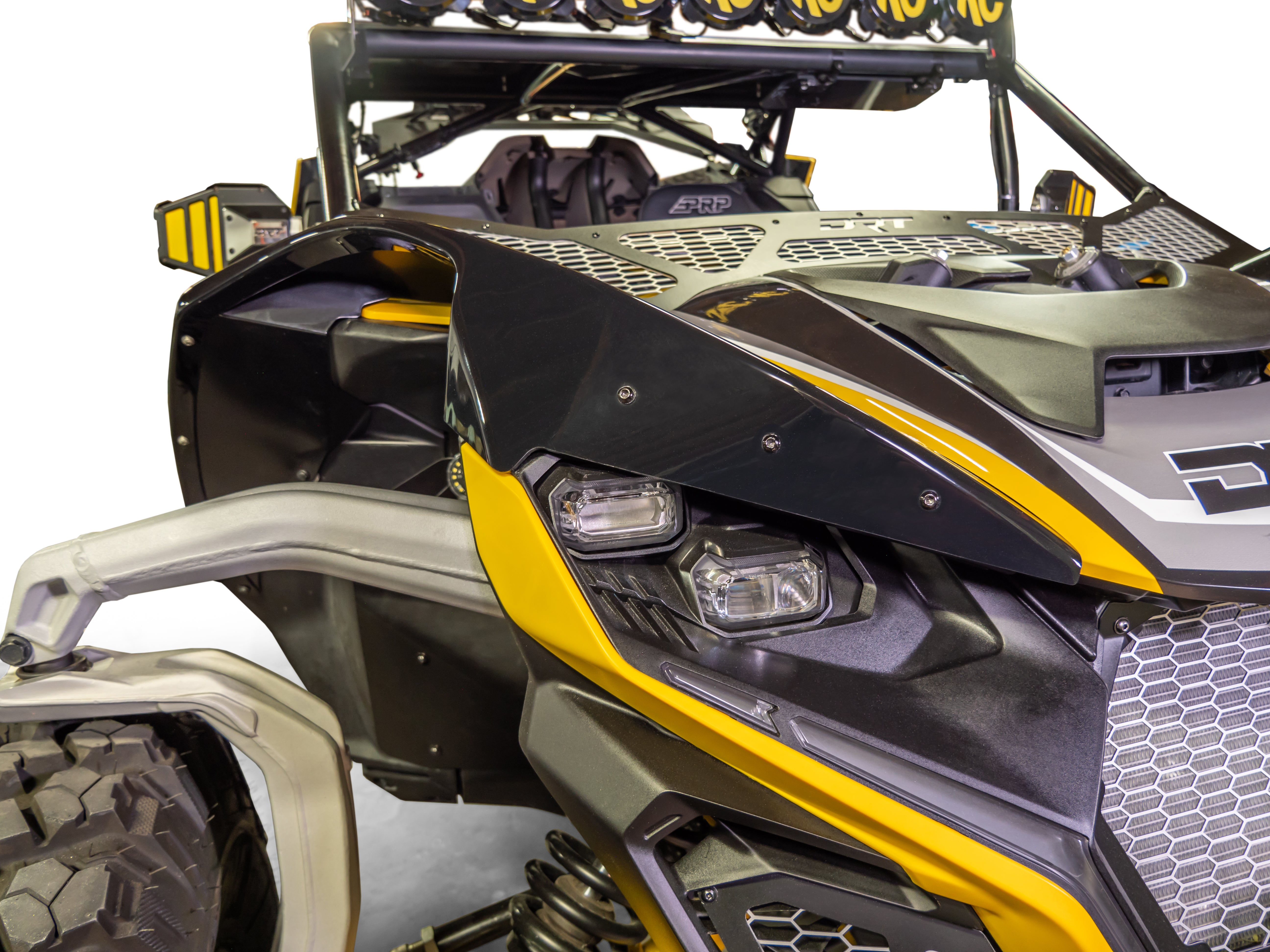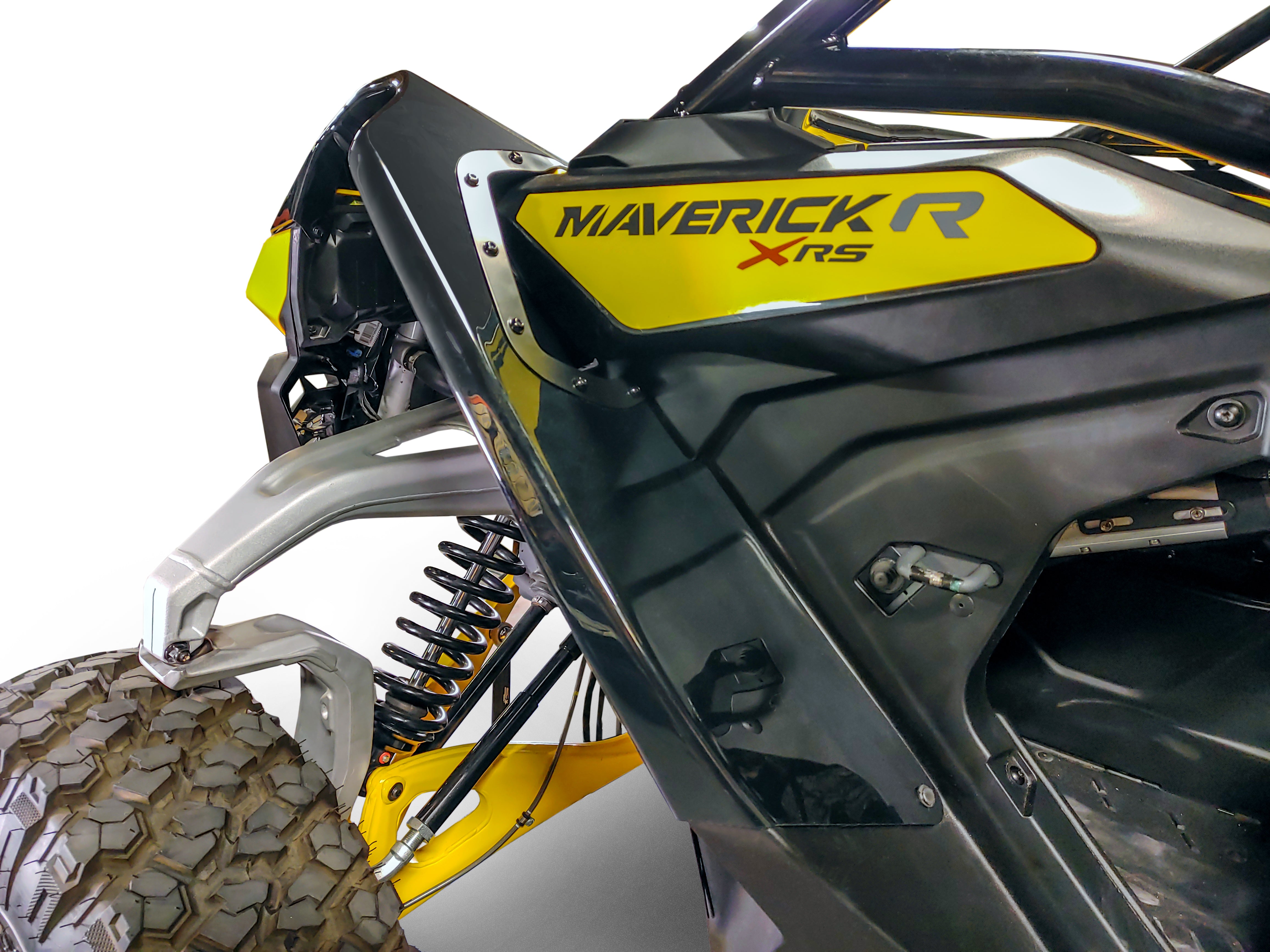 The DRT Motorsports Can Am Maverick R Front Fender Kit is an essential upgrade for protection and styling. Made of high-impact ABS, it is designed to withstand the rigors of hard off-road use. This fender kit complements the Maverick R body lines and provides a more aggressive front-end stance. The stock front upper control arm cutouts create a blow hole for sand, mud, and dirt. The DRT fender kit deflects debris away from the vehicle and passenger area. Premium powder-coated aluminum brackets and aluminum inner splash panels keep everything secure and add extra protection. All brackets and panels are fastened with black corrosion-resistant stainless-steel hardware. The smooth fender finish makes them easy to paint or wrap to match your vehicle color scheme.
