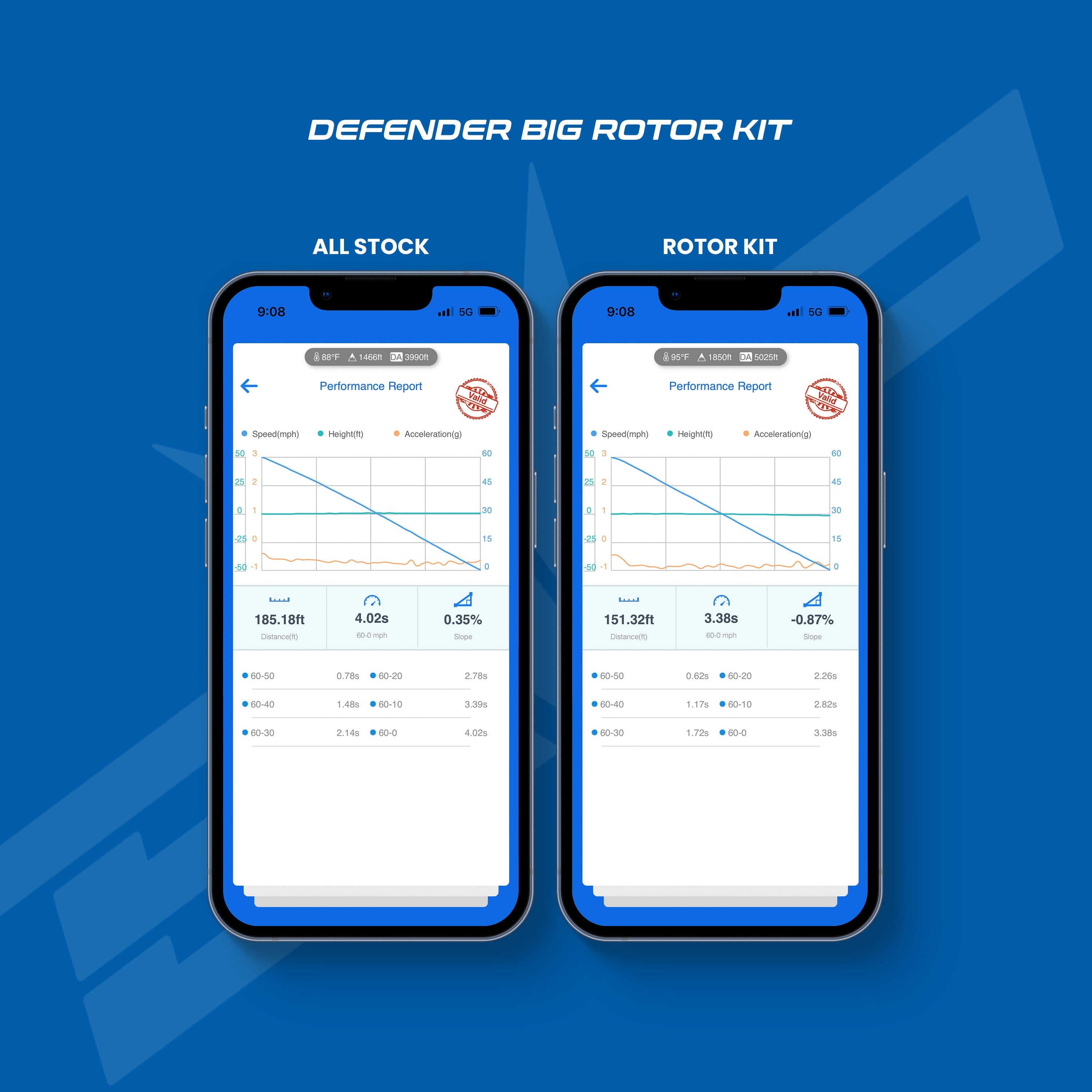 The new EVP Big Rotor Brake Kit delivers the stopping power your full- or mid-size utility side-by-side demands, reducing 60-0 MPH stopping times by more than 15% and shortening stopping distance by more than 18%! Our bolt-on brake rotor kit provides 16% more surface area up front and over 11% more in the rear compared to stock, coupled with a heavier duty thicker profile (4.5 mm, OEM vs 5 mm, EVP). The EVP Big Rotor Kit delivers a substantial improvement in stopping power while also enhancing heat dissipation to prevent premature wear on brake pads and calipers.