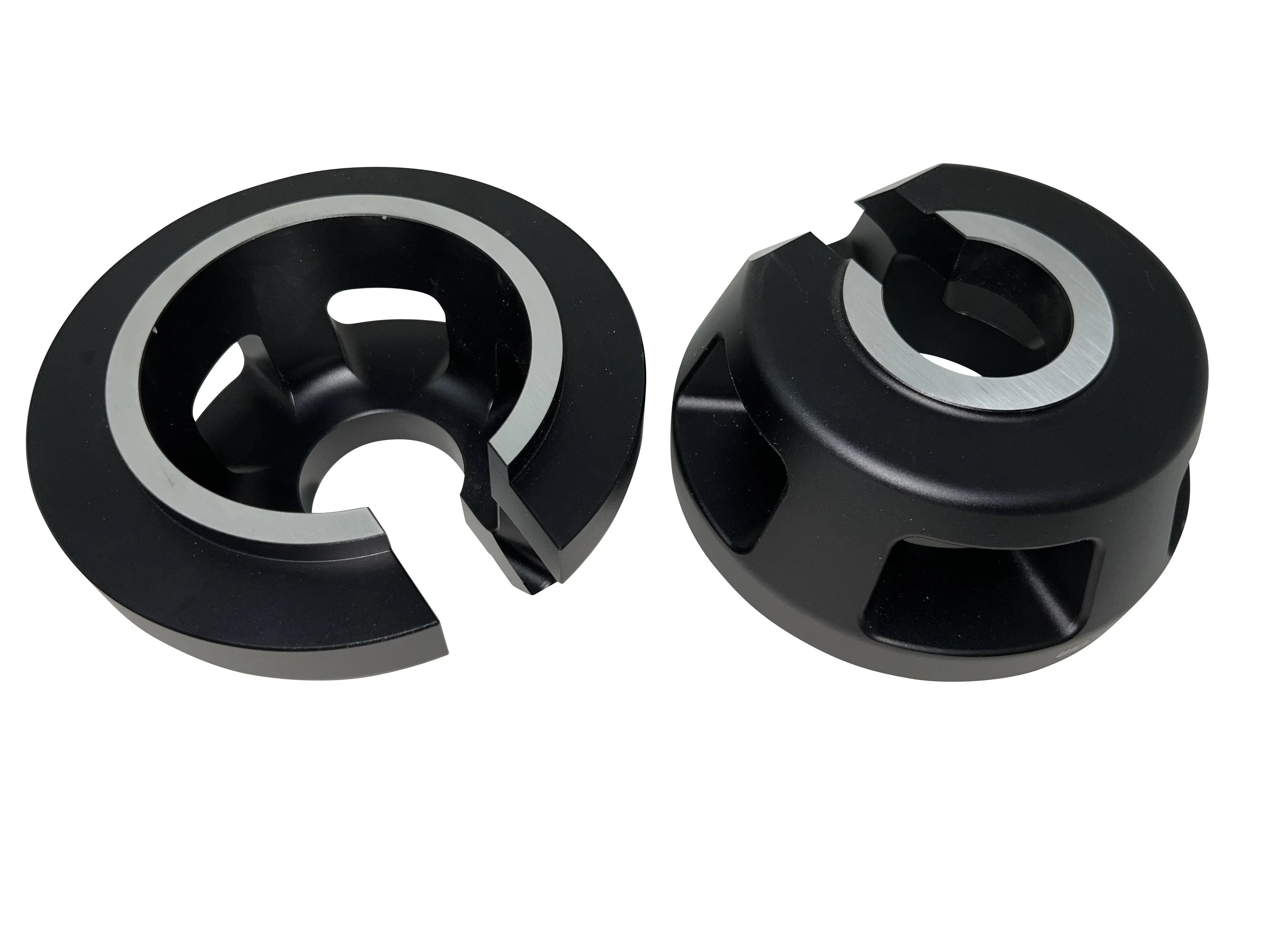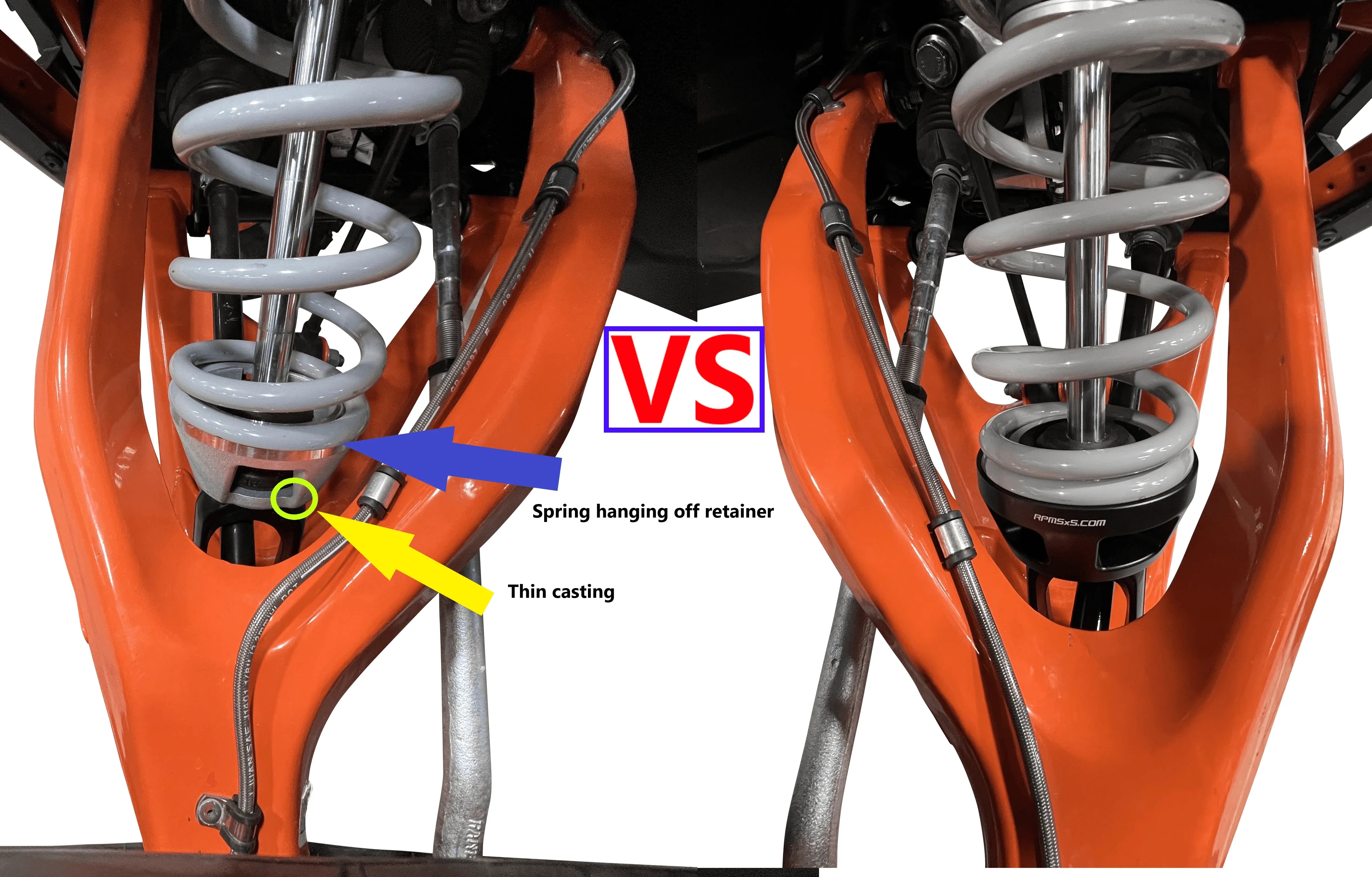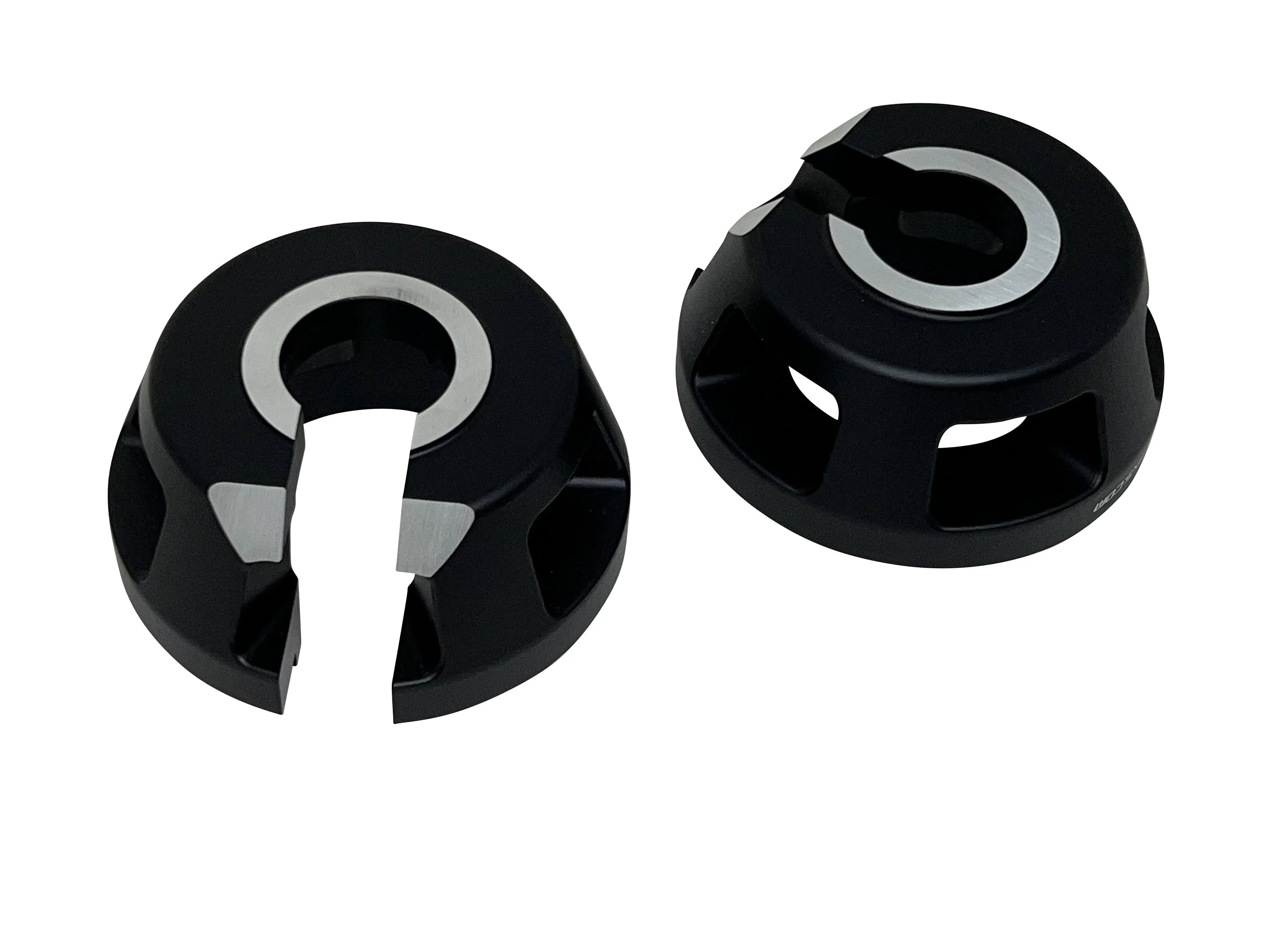 When we find a weak spot, we re-design, over build, and deliver. That's exactly what we have done with the factory Pro R & Turbo R Lower spring retainer cups. Built from 6061 billet, this RPM Retainer cup is nearly 6x stronger than the factory cast piece. We've retained the factory style, while increasing dimensions drastically throughout. The RPM spring cup is not only significantly stronger, but provides more surface area for the factory & aftermarket bottom springs to rest on. These work on factory & RPM HD shock tuning forks. Pair with our RPM Front Tuning Forks for the ultimate bullet proof front end! Sold as a set. Replaces OEM # 5634675 .