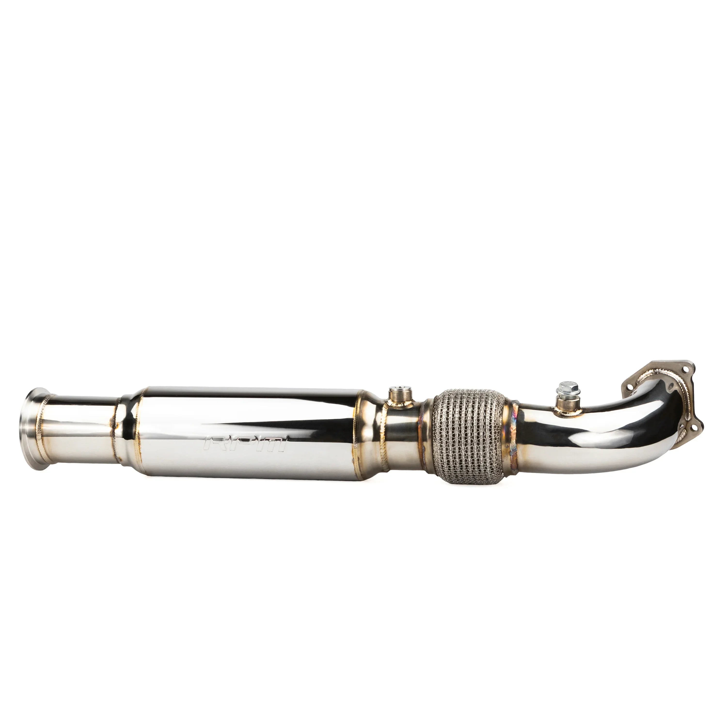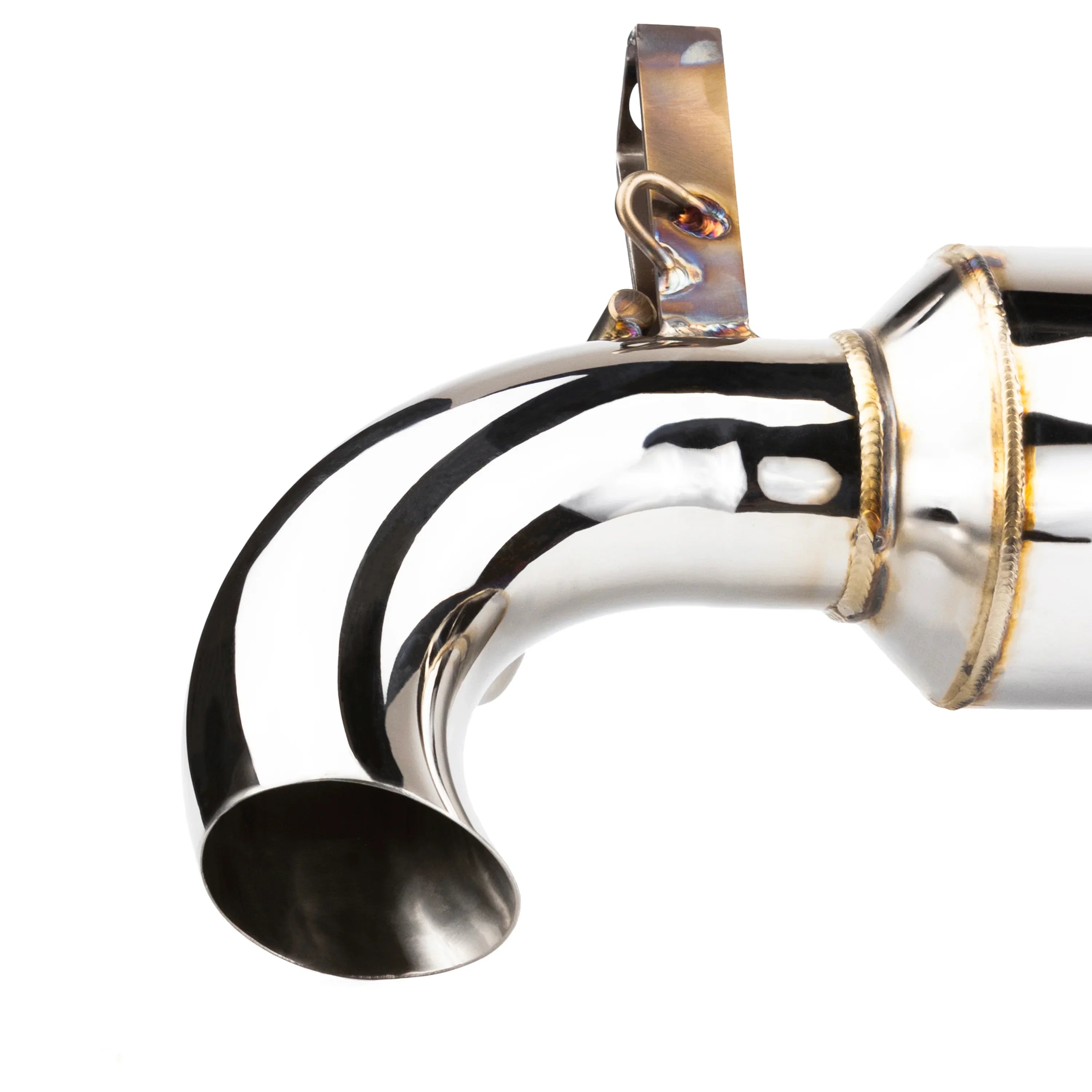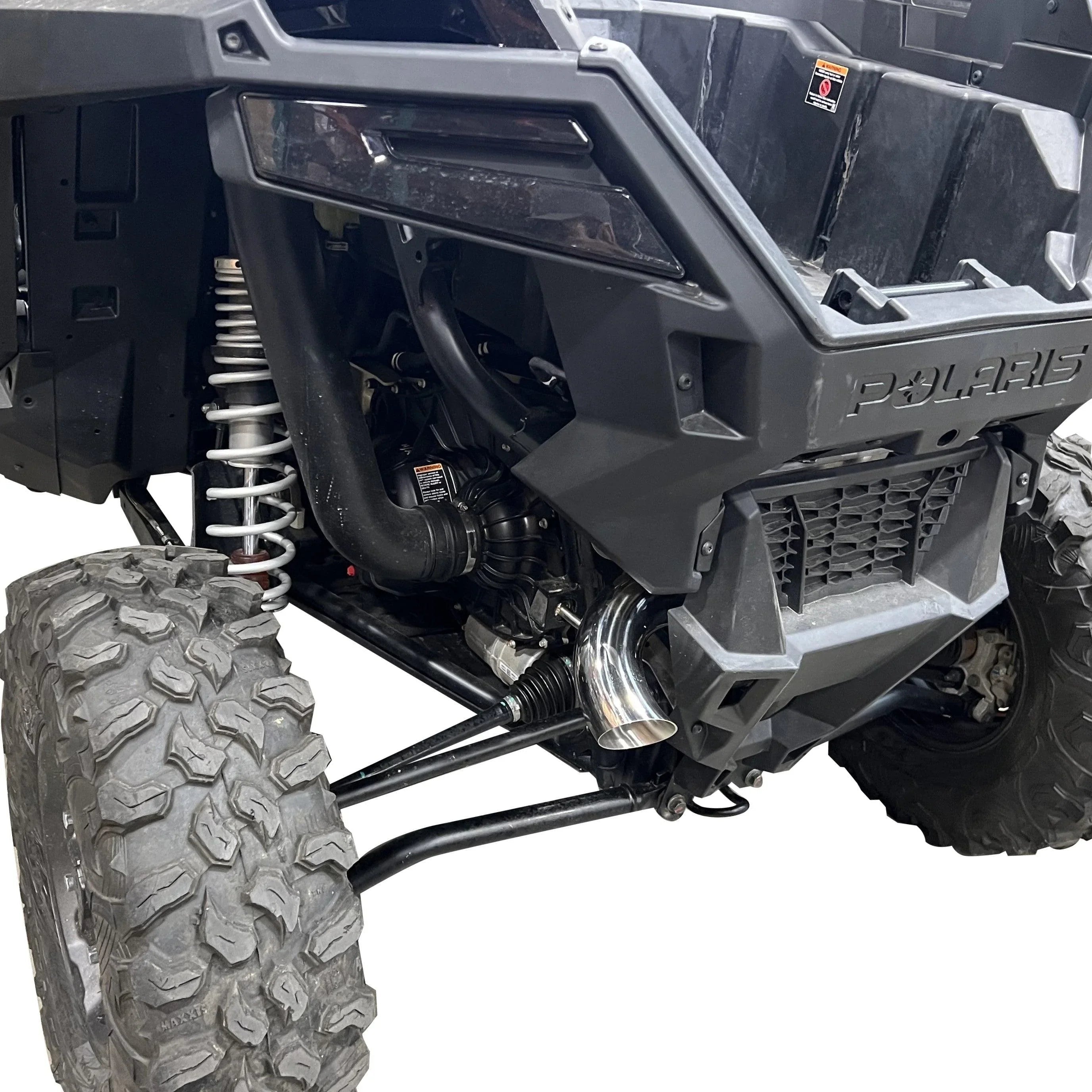 With the popularity of our sport mufflers, & Polaris's bump in HP for their turbo models we knew it was time to step up and provide a FULL 3" exhaust system, and that's what we have mastered! With a deep throaty sound in mind, we mated our 3" mid pipe with a inline muffler to our ever so popular 3" perforated core catless muffler. Our turbo flange is port matched for the absolute highest flowing exhaust on the market & included is our is a port matched turbo manifold gasket. Securing that manifold to the turbo is worry free as we include new grade 8 hardware! The mid pipe is built using a H.D. chain-link flex pipe. The mid pipe and muffler are mated using a stainless v-band clamp connection for a clean free flowing design. For the tip we did a sweeping fish tail and allowed for the use of the stock rear fascia or ditch it and let the world see this piece of art!