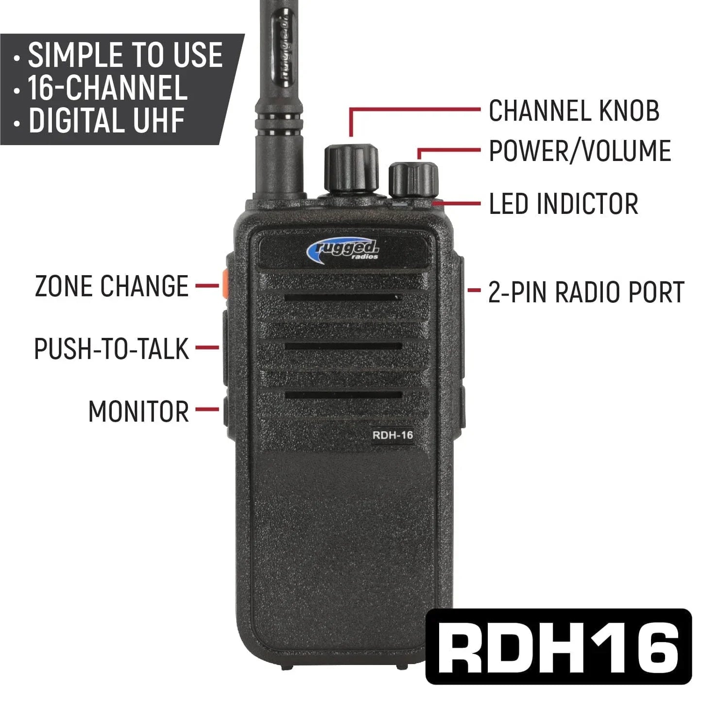 RUGGED Wired Driver Only Communication Kit with RDH16 Radio, ideal for racing communications. With superior power and ultra-clear digital audio, RDH16 delivers unmatched clarity on the track. The kit maintains compatibility with analog systems, while ensuring the best digital sound quality. Tailored for driver-only applications, this custom package includes a helmet kit, AlphaBud earbuds, push-to-talk button, and an optional handheld radio for seamless communication. Features include a racing-specific configuration, powerful RDH16 UHF digital radio, rugged harness with molded jacks, high-bend test cables, and Total Shield RF blocking. The AlphaBud earbuds deliver loud, crisp audio. Also included are a handheld radio, radio box, wired communication harness, and push-to-talk button. Works with all UHF business band radios operating on the same frequencies.