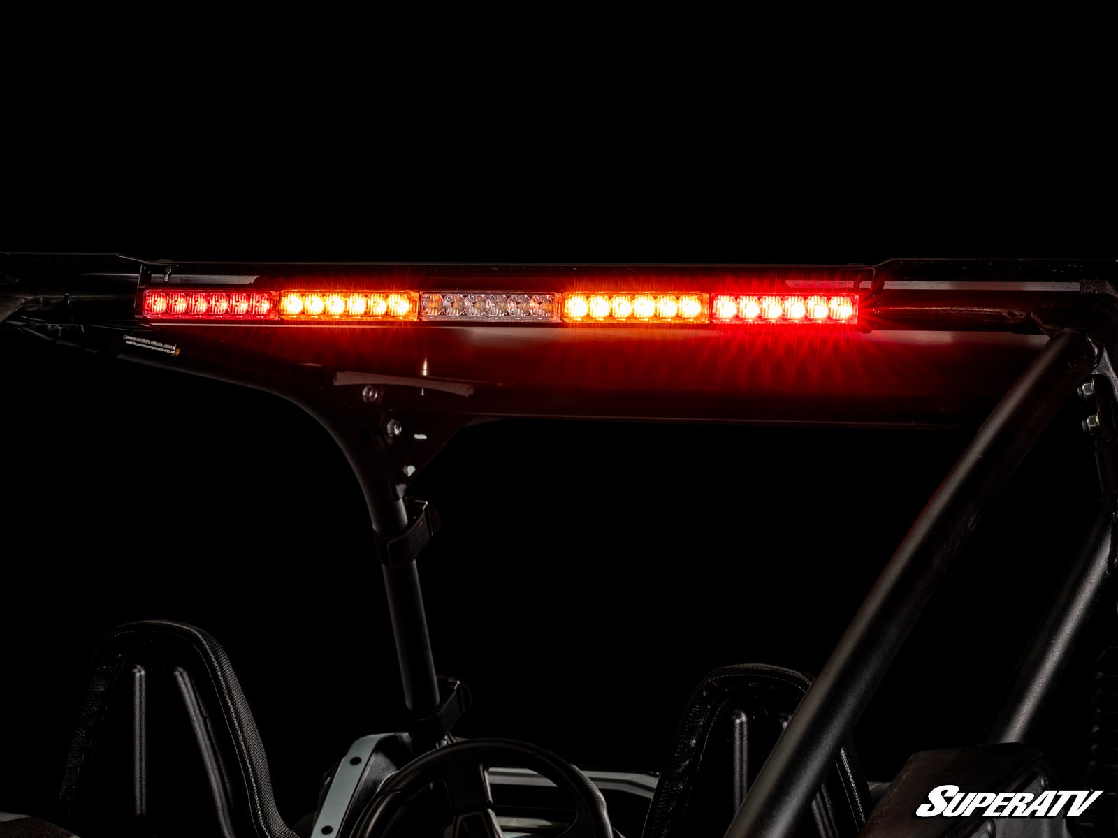 This 30” chase bar has three colors to maximize utility and visibility. The red and amber lights cut through dust to make you visible when you’re kicking up rooster tails day and night. The center white light works as a flood light to illuminate a work area in the dark. Plus, multiple strobe effects increase visibility even more to ensure the guy behind always sees you.