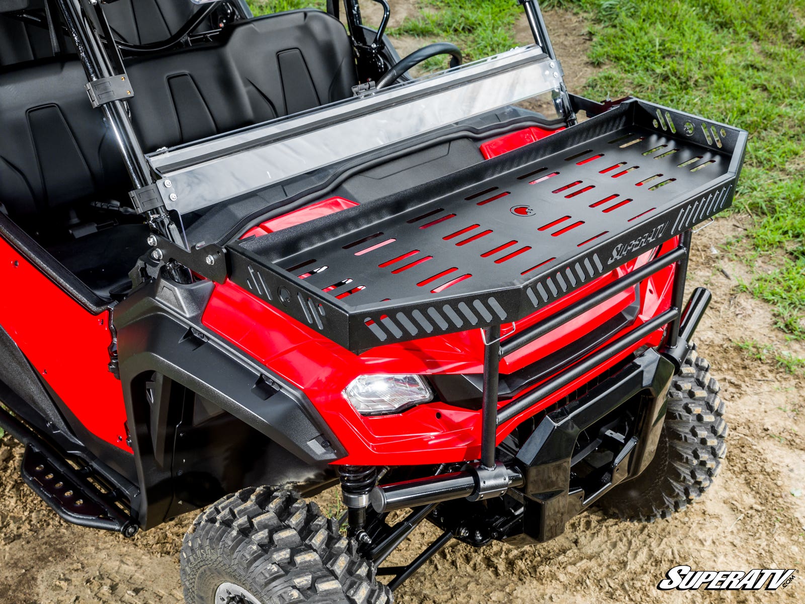 This Honda Pioneer front rack is built with a 250-pound capacity so you can haul all kinds of gear. The slotted side panels and floor give you tons of places to tie down your supplies. And since it’s on the hood, you can park up and reach everything you need without leaving your cab.
