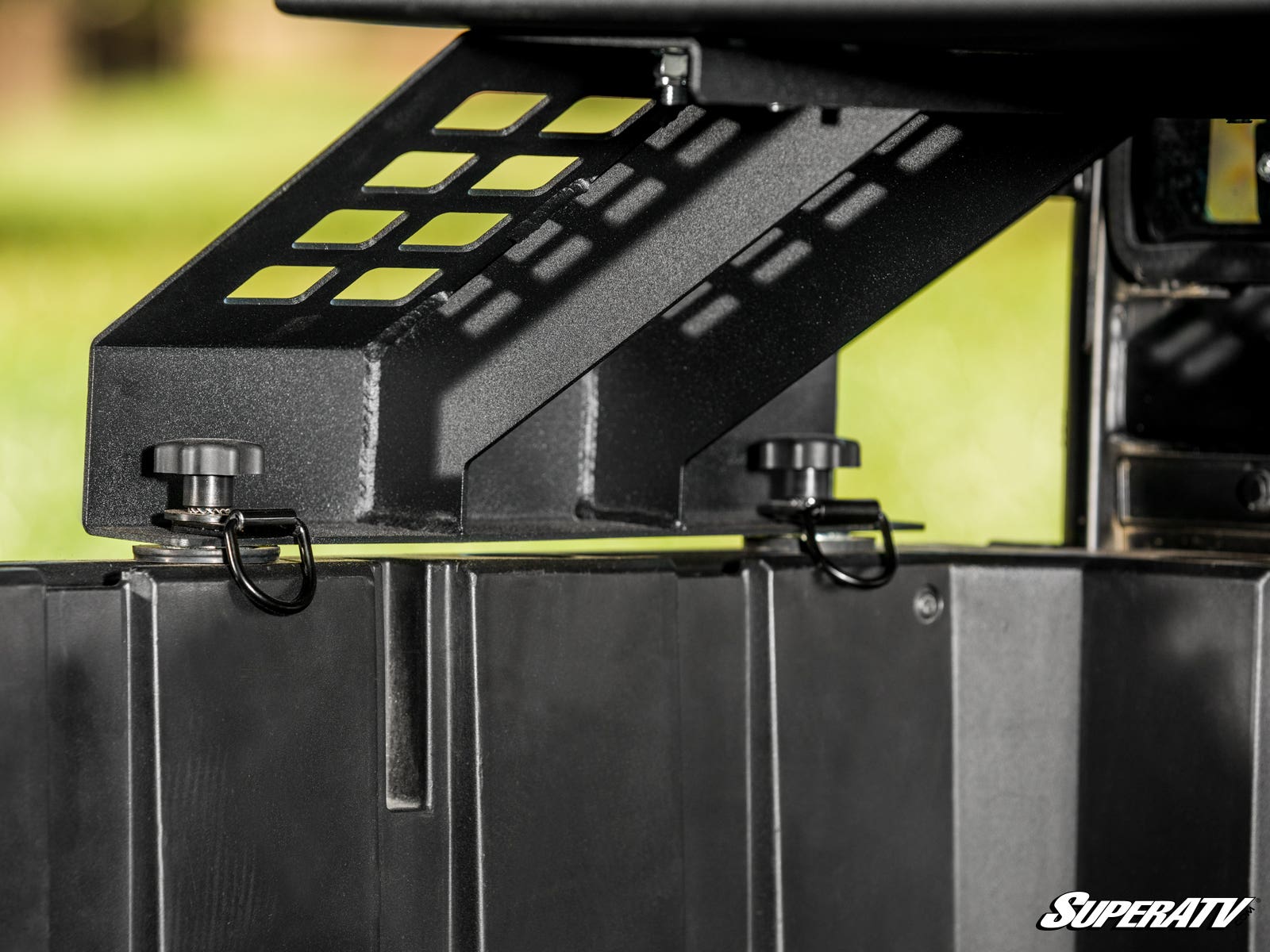 Our included latch and go tie downs make this Polaris General rack super easy to install. The tie downs slot into OEM locations on the bed. All you have to do is follow the instructions to locate the holes, assemble the rack, then use the thumb screws to tighten it all down. The tie downs even include D-rings for additional latching points for cargo. It’s easy and convenient!