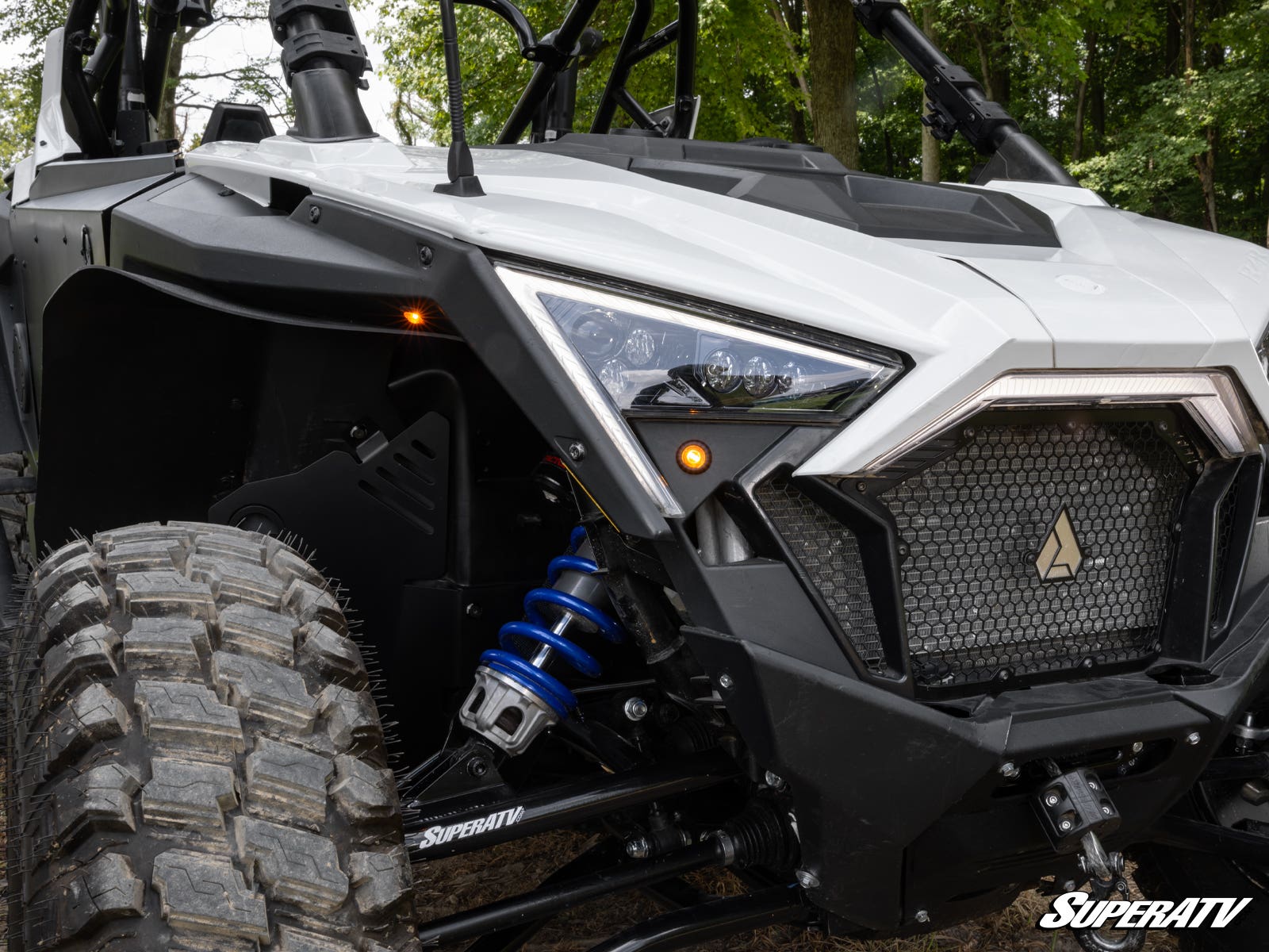 Our kit includes four amber LED lights for the front—two for each front corner. It connects directly to your RZR PRO XP’s rear OEM taillights to turn them into signals too.