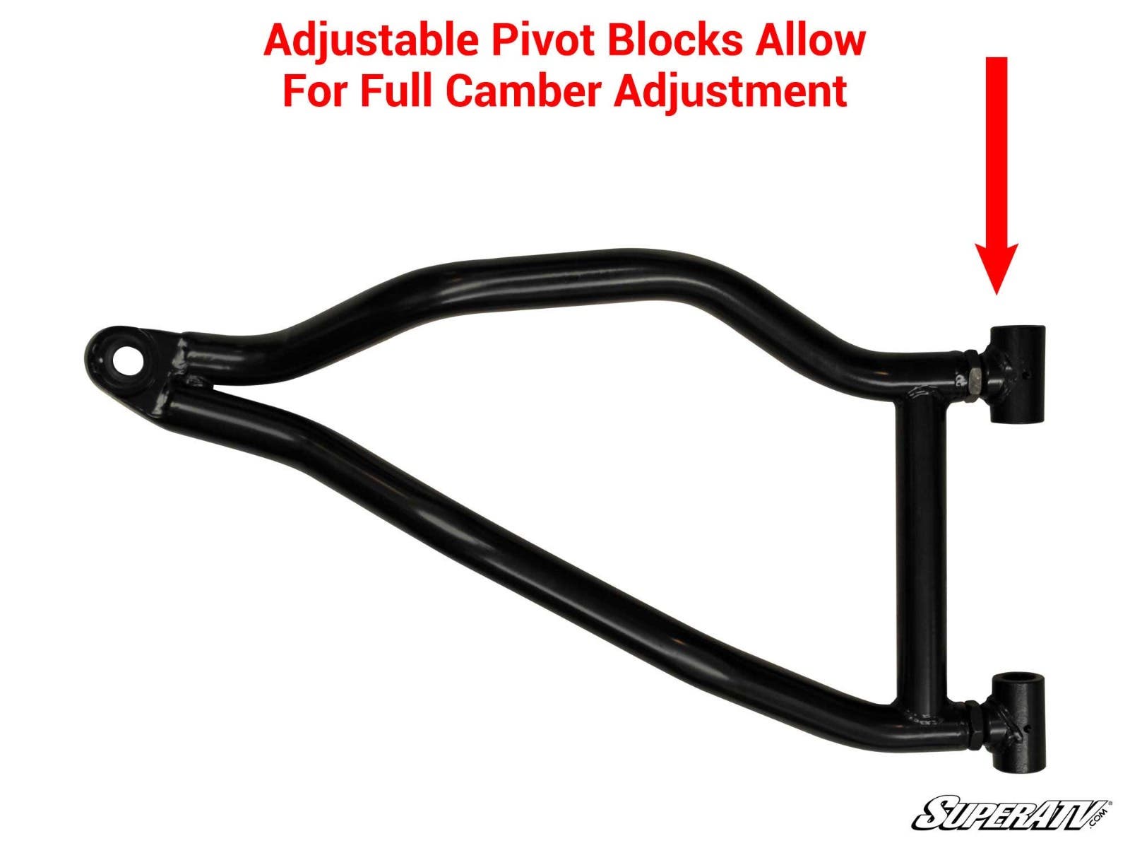 Our use of industry-leading adjustable pivot blocks allows you to adjust your alignment and maintain perfect camber, no matter where or how you ride. Being able to adjust your camber as needed can eliminate the premature tire wear that usually comes along with adding a lift kit or bigger tires. If you don’t want to mess with your pivot blocks, don’t worry! We pre-adjust them to stock specifications right out of the box, so you only need to make adjustments if you want to.
